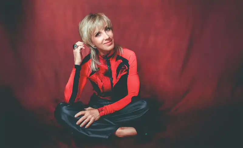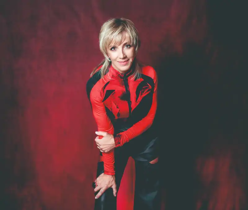 Ana Torroja posa con una mano sobre su pierna y vestida de rojo y negro.