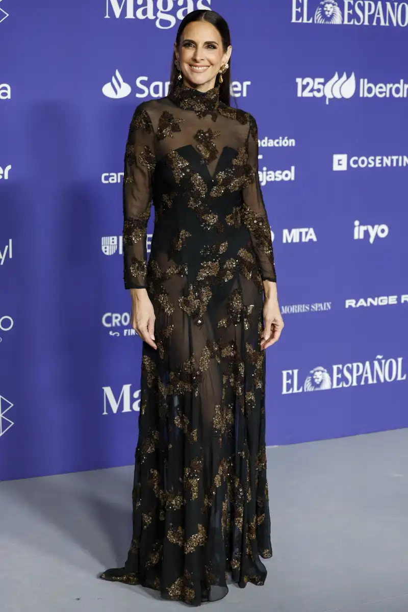 La presentadora ha arrasado con un elegantísimo vestido de palabra de honor en color negro. La comunicadora ha añadido un vestido semitrasparente de manga larga con pedrería que ha sumado sofisticación al outfit. Para lograr un look perfecto ha añadido zapatos metalizados y bolso a tono.