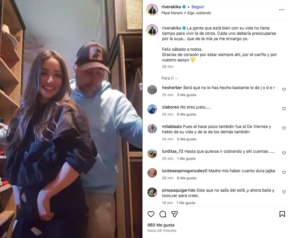 Sin embargo, estas palabras no han sentado bien a Kiko, que ha tardado bien poco en usar su cuenta oficial de Instagram para grabarse un vídeo junto a su nueva novia en el que han lanzado un mensaje a Irene. “La gente que está bien con su vida no tiene tiempo para vivir la de otros. Cada uno debería preocuparse por la suya… que de la mía ya me encargo yo”, escribía Kiko en este post.