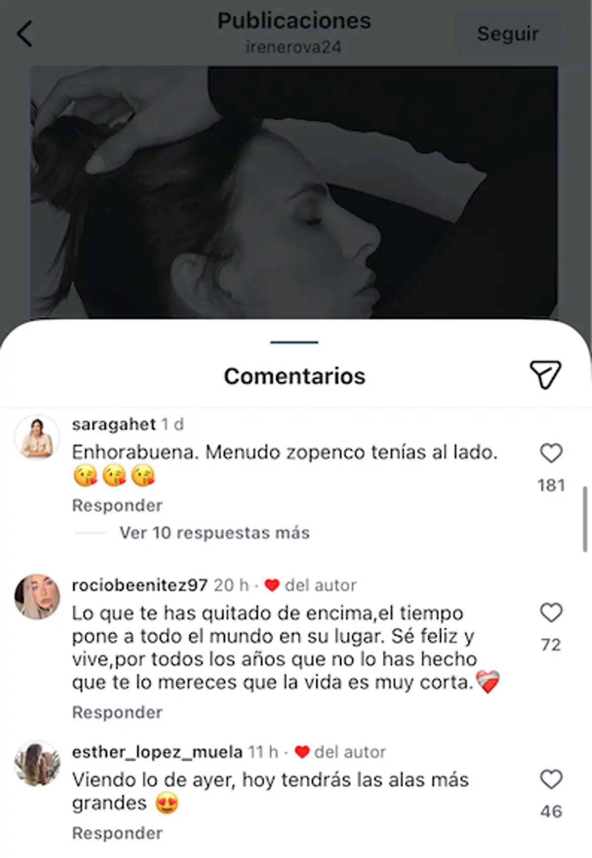 Que nunca se te olvide que la brava eres tú, ¡fuera el machismo!”, “Sé feliz y vive por todos los años en los que no lo has hecho. Que te lo mereces, que la vida es muy corta”, “Viendo lo de ayer, hoy tendrás las alas más grandes”, “No bajes al nivel de los otros, eres referente para tus niñas y eso es lo más importante, ole tú”, “libre Irene libreeeeee”, “Coge fuerzas porque ya viene el otro atacando por la retaguardia.