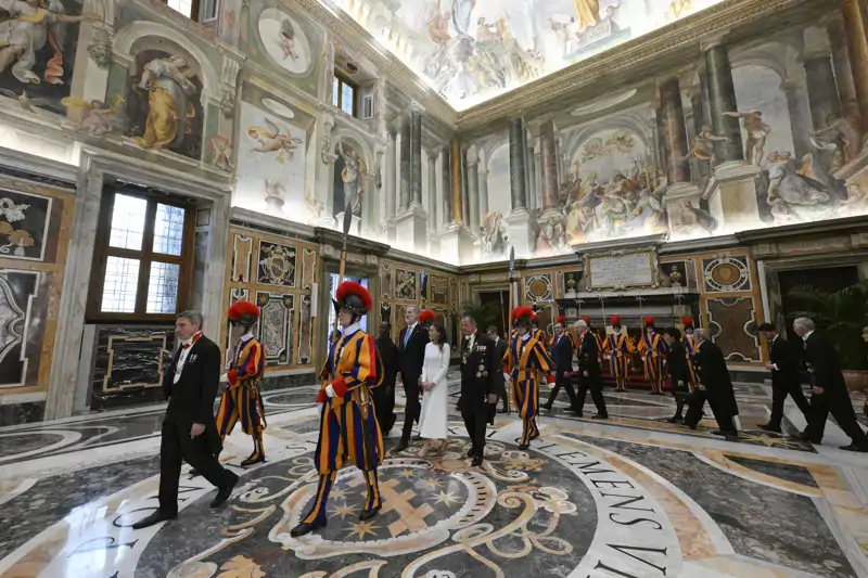Los Reyes Felipe y Letizia acompañados por la Guardia Suiza en el Vaticano