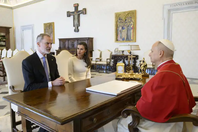 Los Reyes Felipe y Letizia con el Papa León XIV en su biblioteca privada