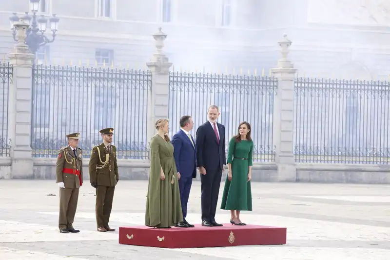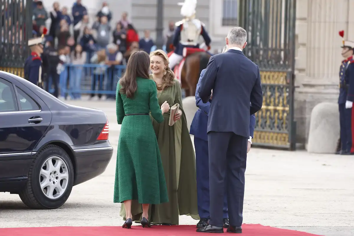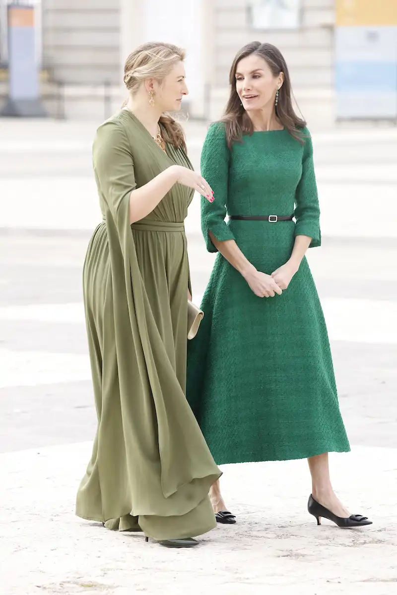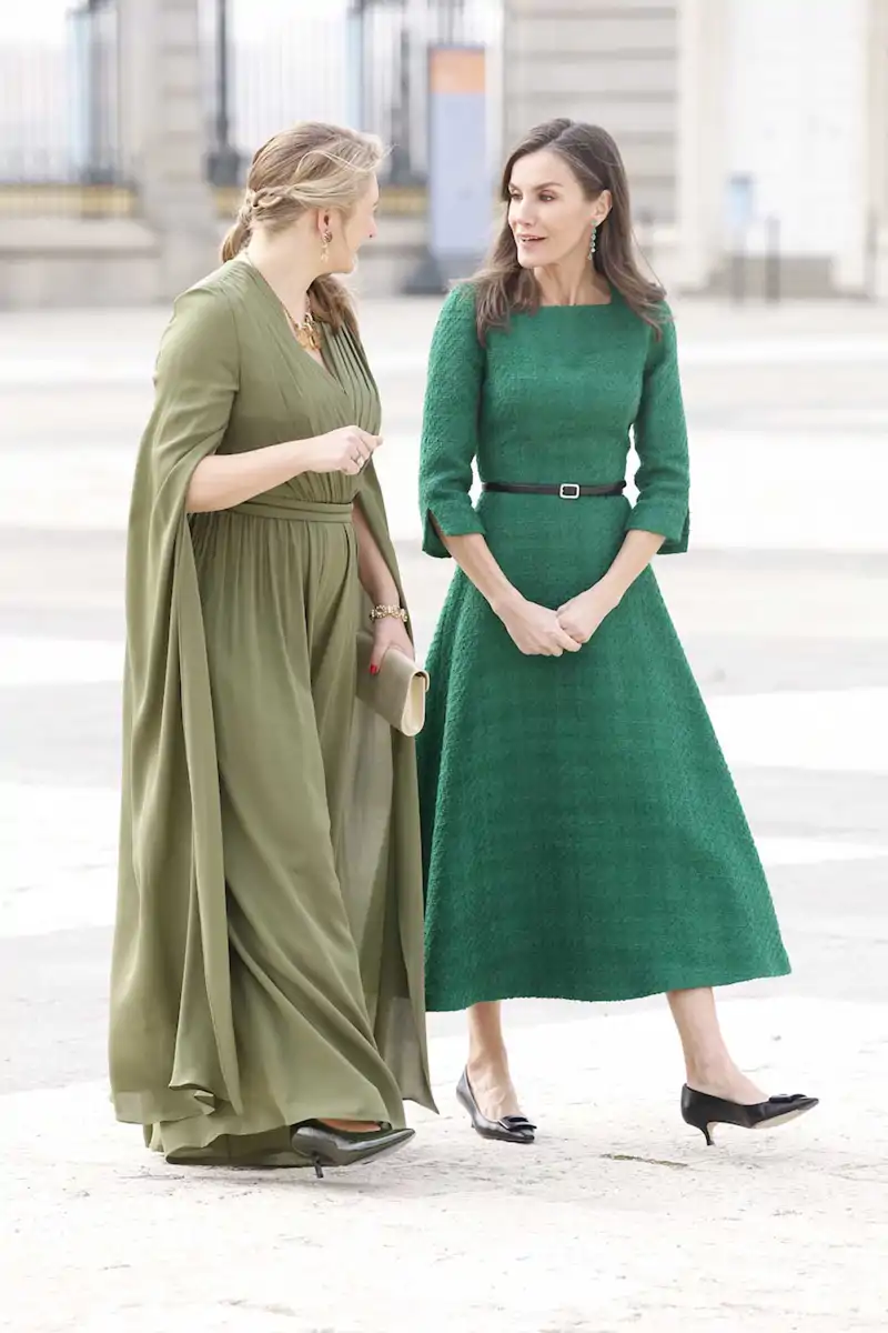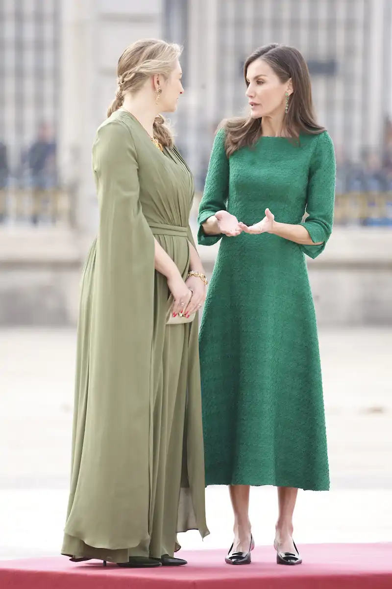 La Reina Letizia ha apostado para esta bienvenida oficial por un vestido de tweed en un favorecedor color verde y salones kitten heel en negro con hebilla cuadrada. El mismo look que ha llevado tan solo unas horas antes para inaugurar la Feria Internacional de Arte Contemporáneo de Madrid.