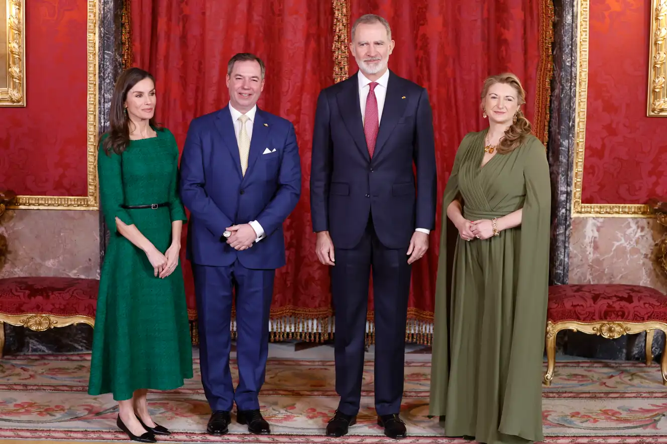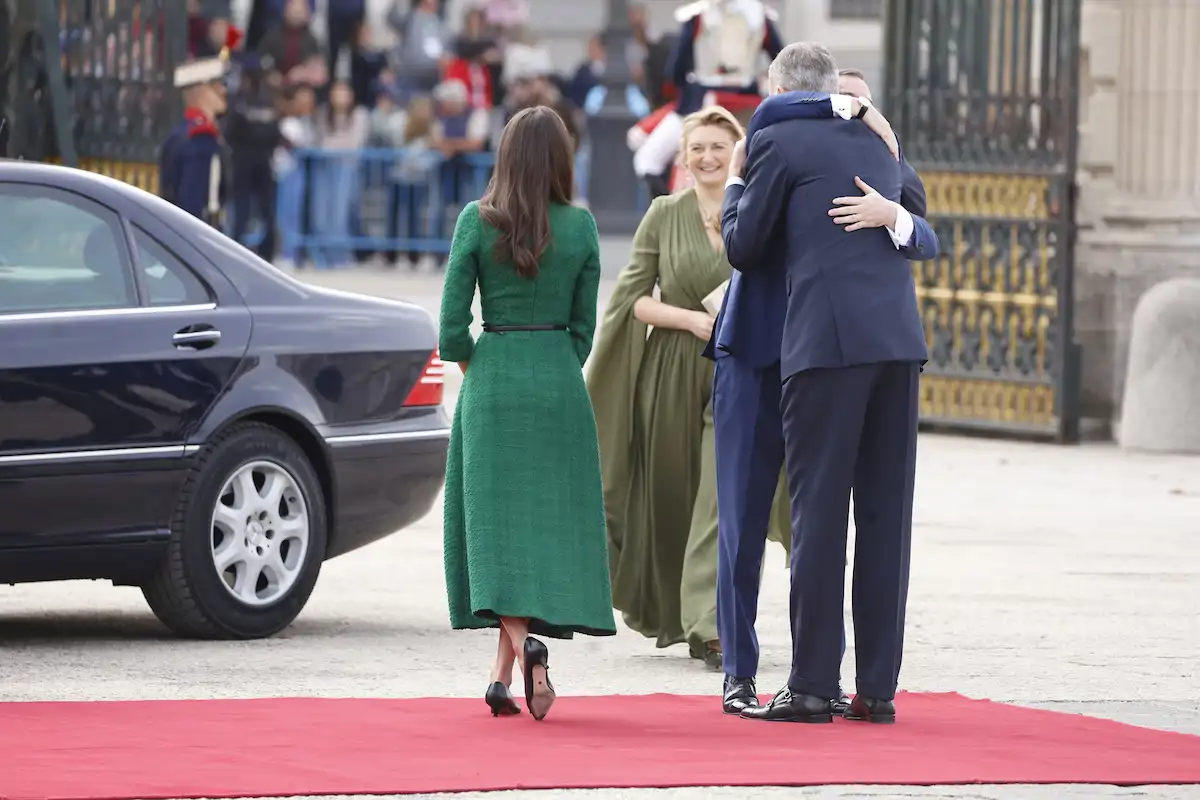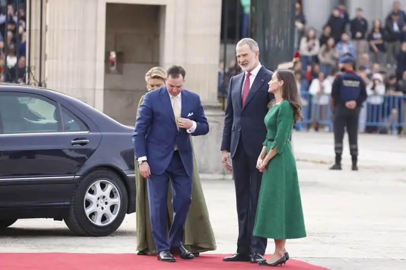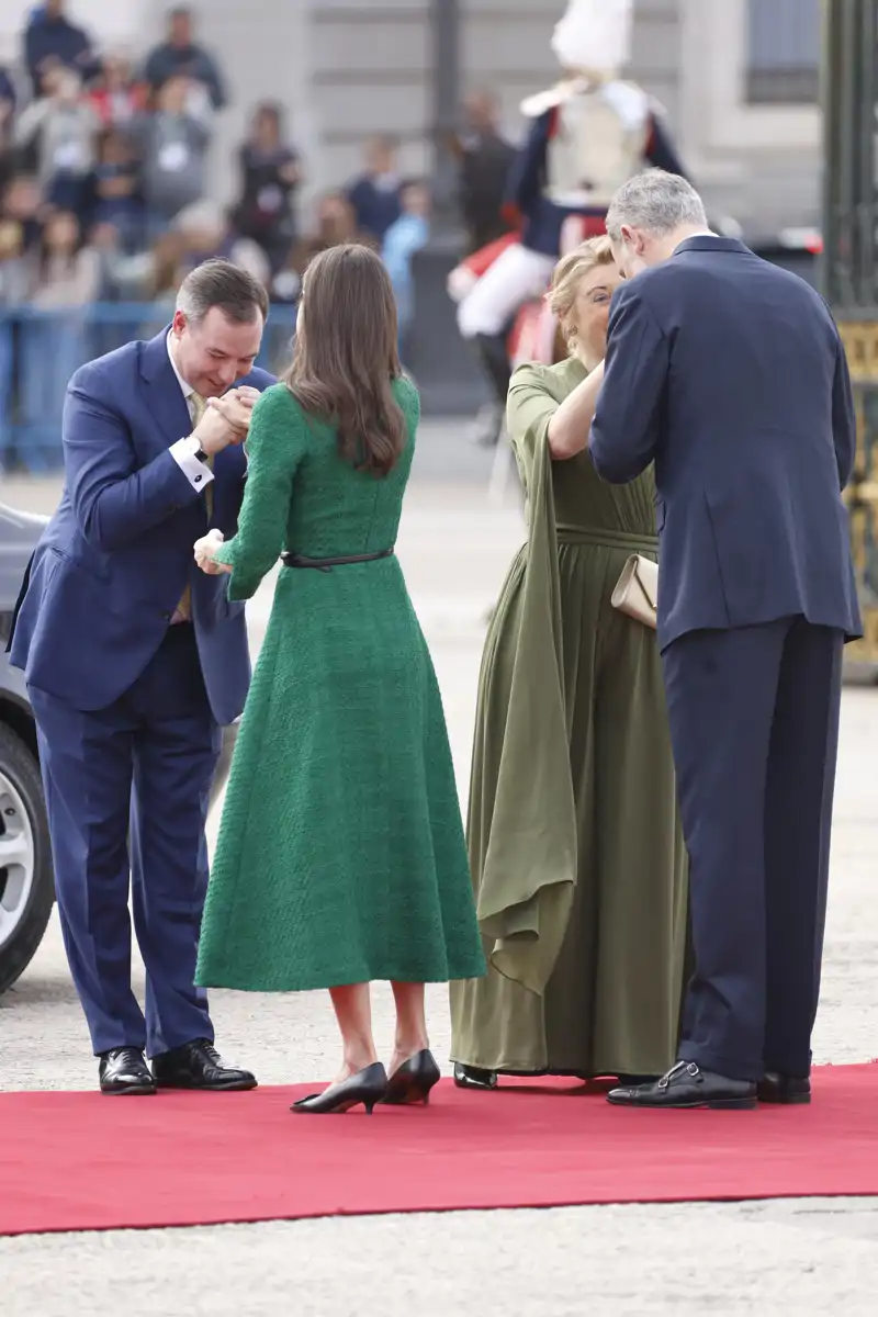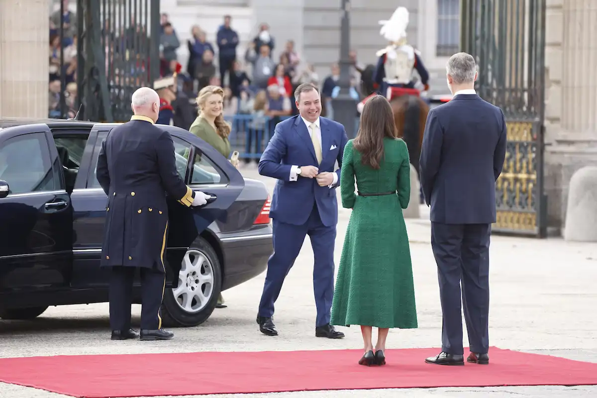 Felipe VI se ha fundido en un abrazo cómplice nada más ver a Guillermo V, este ha optado por tomar la mano cortésmente de doña Letizia. “¿Hablas un poco de español?”, se interesaba la mujer de Felipe VI. A lo que él contestaba de forma negativa. La Gran Duquesa ha elegido para la ocasión un vestido con escote drapeado en uve, en color verde botella con mangas de estilo murciélago y falda fluida.