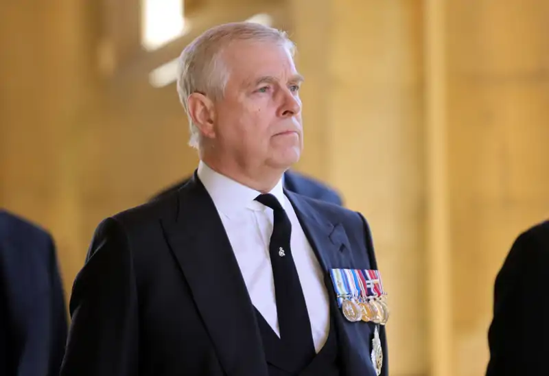Andrés de Inglaterra, muy serio, durante el funeral por el Duque de Edimburgo celebrado en Berkshire en 2021. A finales de 2025, Carlos III le despojó de su título de Príncipe.