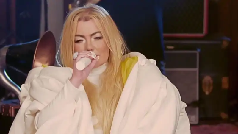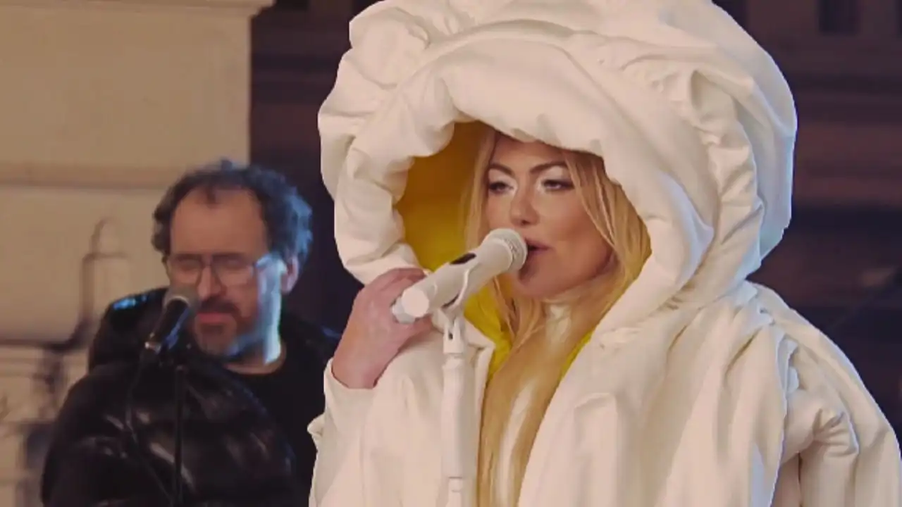 La cantante apareció en escena vestida con un abultado y acolchado abrigo blanco XXL, capucha abultada sobre la cabeza, por debajo más blanco, cabello rubio casi blanco, maquillaje blanco…