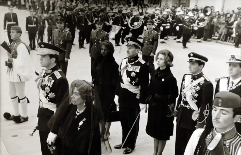 Funeral por Pablo de Grecia en Atenas, en 1964, con su mujer, Federica de Grecia, liderando la comitiva, acompañada de la Reina Sofía (segunda línea a la izquierda) y sus hermanos, Constantino e Irene de Grecia, a su lado.