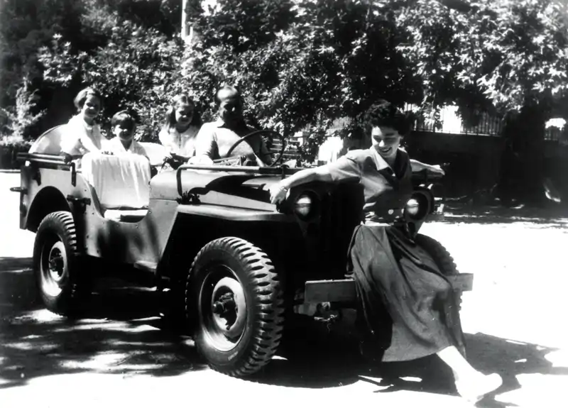 La familia real griega en una divertida imagen en los jardines del palacio de Tatoi, alrededor de 1948: Irene y Sofía y Constantino de pequeños, en los puestos traseros del coche, Pablo de Grecia en el lugar del conductor y Federica de Grecia posando delante.