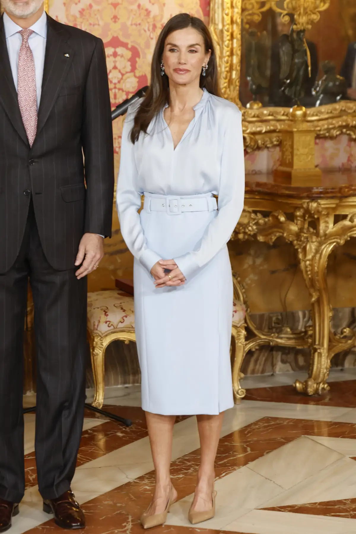 La monarca ha rescatado de su armario esta falda lápiz en color celeste de la firma Hugo Boss.