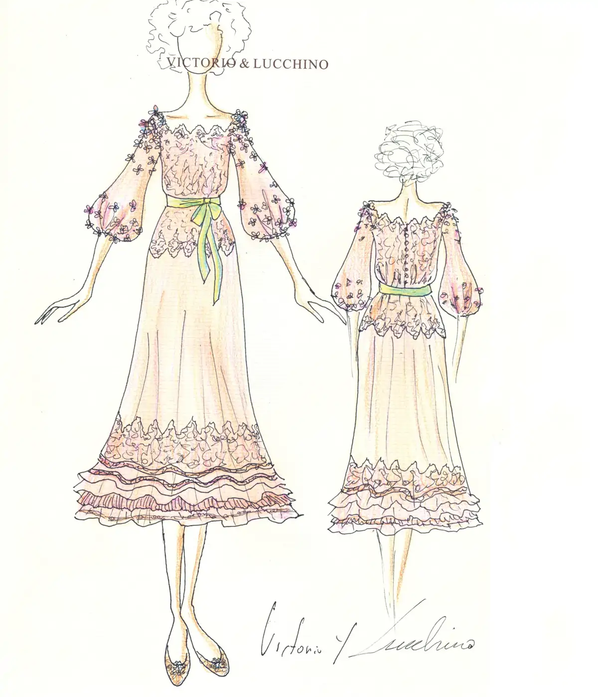 Cayetana lucía un broche en el pelo y unos pendientes de brillantes que le prestó su hija Eugenia; boceto del vestido de Victorio y Lucchino confeccionado en gasa de seda natural, escote barco y mangas abullonadas, salpicadas de perlas; detalle de las pulseras, una obsequio de la reina Victoria Eugenia, y la otra, regalo de pedida de su primer marido; y por último, botonadura trasera y lazo de terciopelo verde en homenaje a Andalucía.