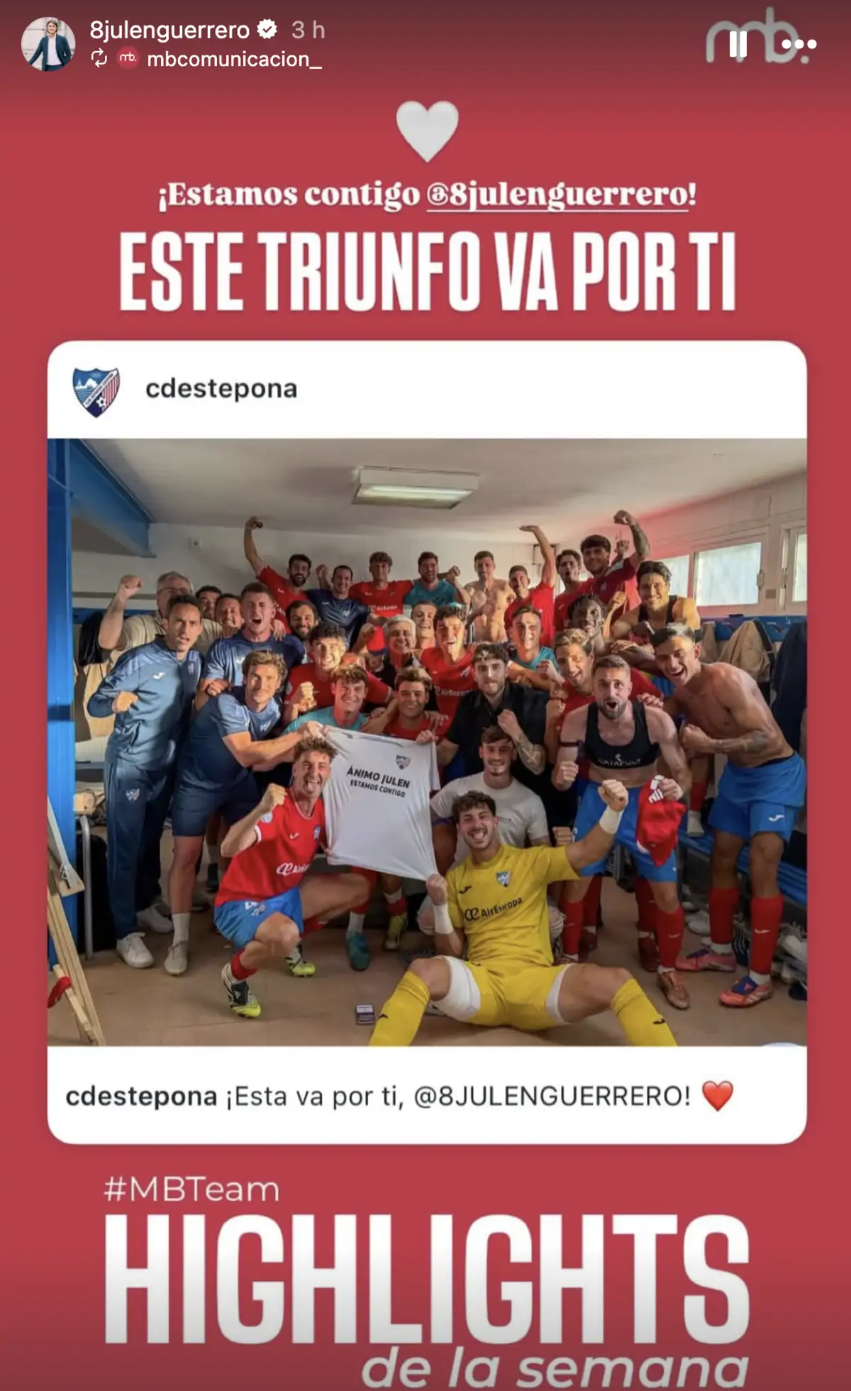 Además de compartir la publicación del Estepona, Julen ha querido dejar unas palabras de agradecimiento a todos los que se han parado un minuto para dedicarle esta victoria en uno momento de tanto dolor para él y su familia.