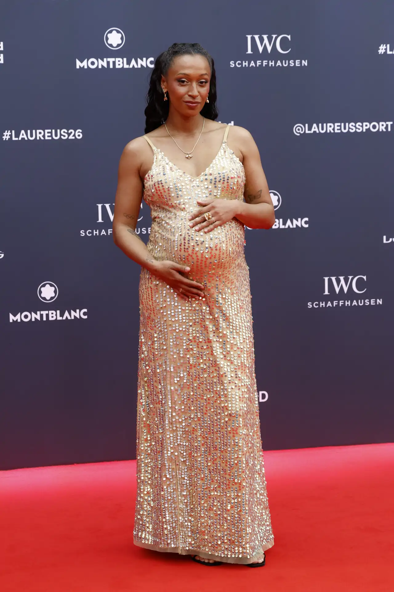 La atletista española, que espera a su segundo hijo, ha optado por un vestido dorado de tirantes, que marca su tripa de embarazada.