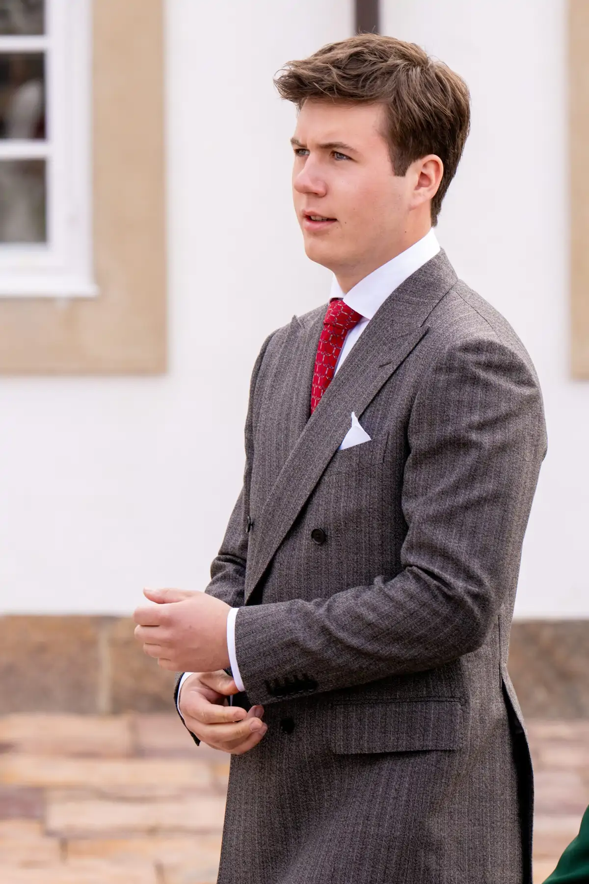 Christian de Dinamarca llevaba tiempo sin aparecer. No ha querido perderse la confirmación de sus hermanos. Para el evento, el príncipe heredero ha lucido un traje gris y corbata en color rojo.
