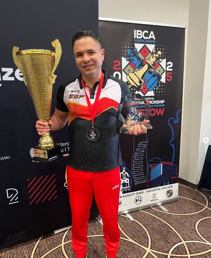 Con diez años ya formaba parte de la selección española de la ONCE. Desde entonces, su progresión ha sido constante hasta alcanzar en 2025 su mayor logro: proclamarse campeón del mundo de ajedrez para personas con discapacidad visual en un torneo organizado por la IBCA.